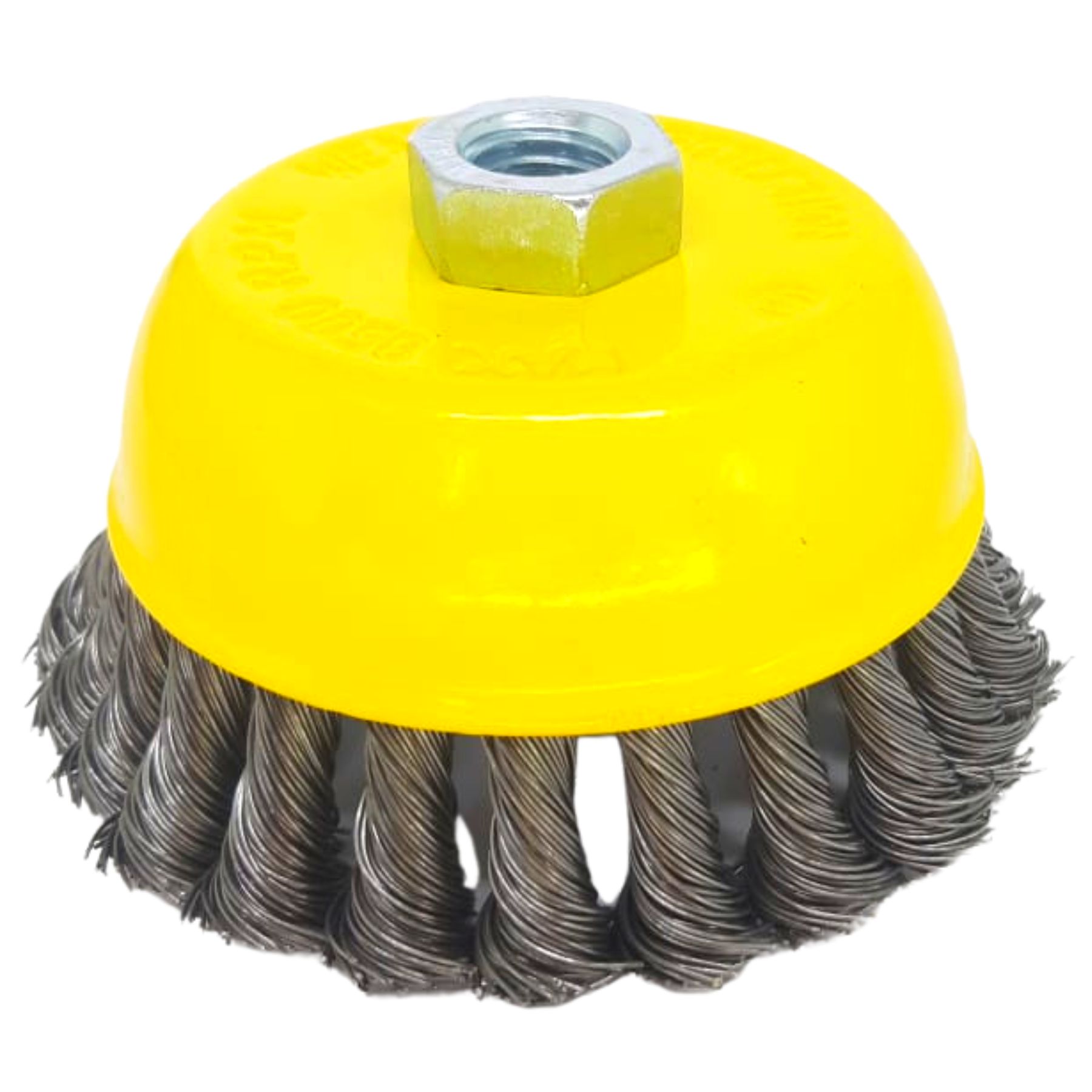 A Escova de Aço Trançado Tipo Copo de Eixo M14 de 4" (100 mm) da Fertak para Esmerilhadeira é indicada para limpeza pesada de superfícies de ferrugem, sujeira, remoção de pintura e limpeza de solda. Ideal para grandes áreas.
